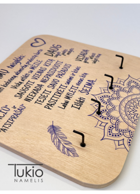 Stilinga medinė raktinė su užrašu „Šiuos namus saugome mes ir mūsų angelas sargas“ – puiki detalė Jūsų namų interjerui.