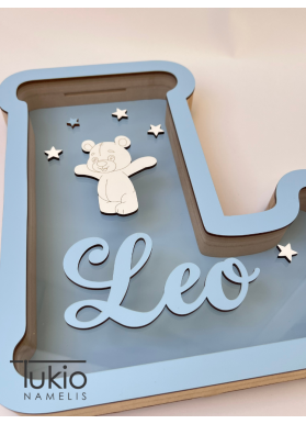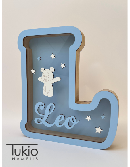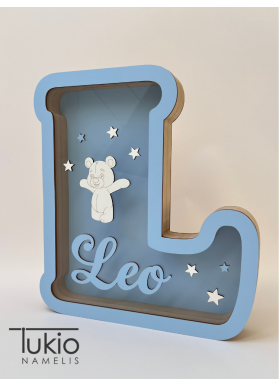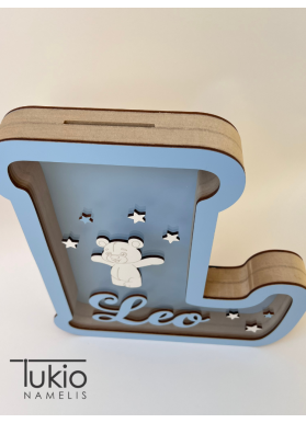 Medinė taupyklė raidės formos (30 cm) – miela ir asmeniška dovana vaikui. Taupyklę puošia meškučio dekoras ir vaiko vardas, todėl ji tampa unikaliu kambario akcentu bei gražiu prisiminimu.