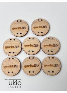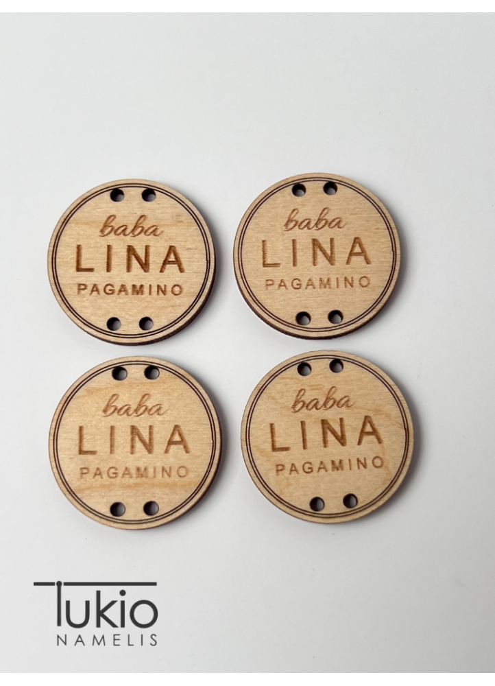 Medinės etiketės su norimu užrašu arba Jūsų logotipu. Dydis apie 3 cm.