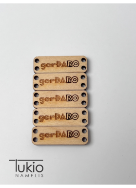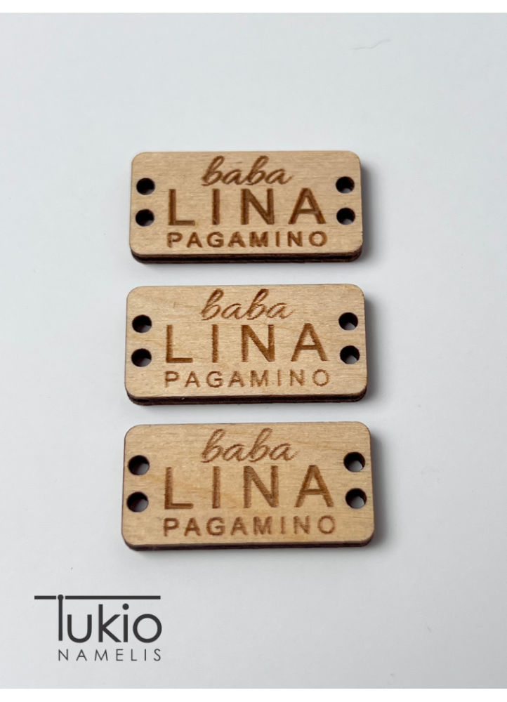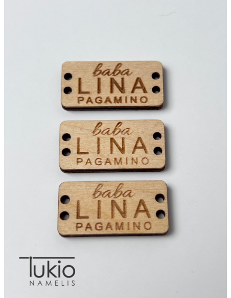 Medinės etiketės su norimu užrašu arba Jūsų logotipu. Dydis apie 3x1,5 cm.