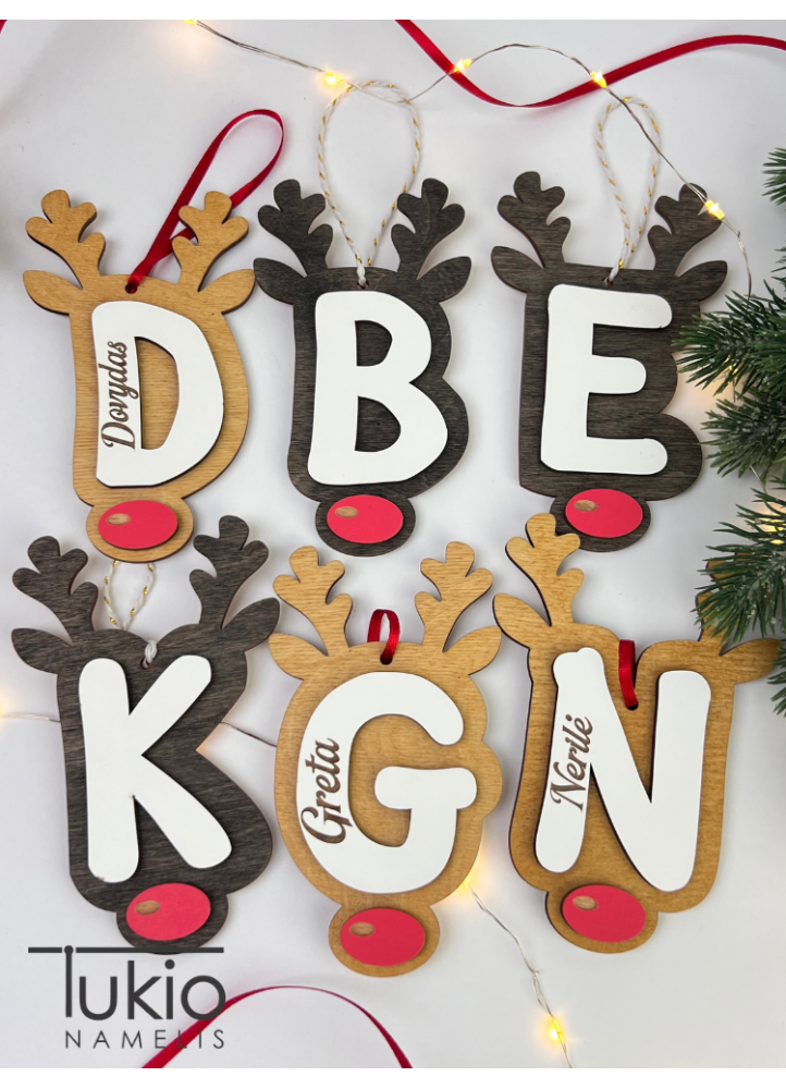 Kalėdų eglutės žaisliukas vardo raide su elniuko ragais ir raudona nosyte . Puikus pasirinkimas norint sukurti jaukią, asmenišką ir išskirtinę šventinę atmosferą.
