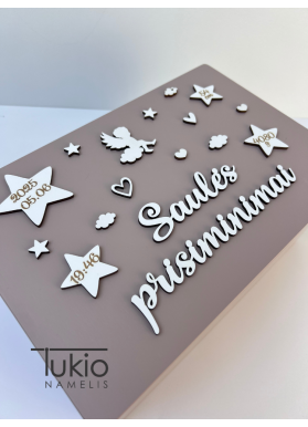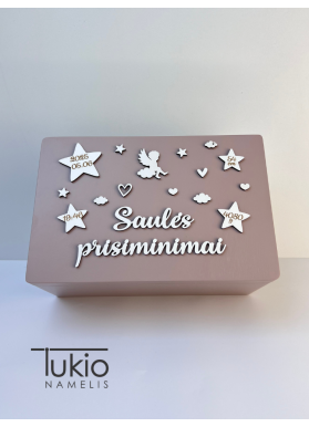 Krikštadėžė dekoruota angelu ir žvaigždėmis. Išskirtinė, rankų darbo medinė krikštadėžė, sukurta ypatingai vaiko krikšto šventei. Dėžutę puošia švelnus angelo motyvas ir žvaigždutės, ant kurių išgraviruoti vaiko gimimo duomenys – data, laikas, ūgis ir svoris.