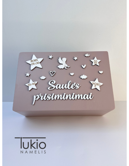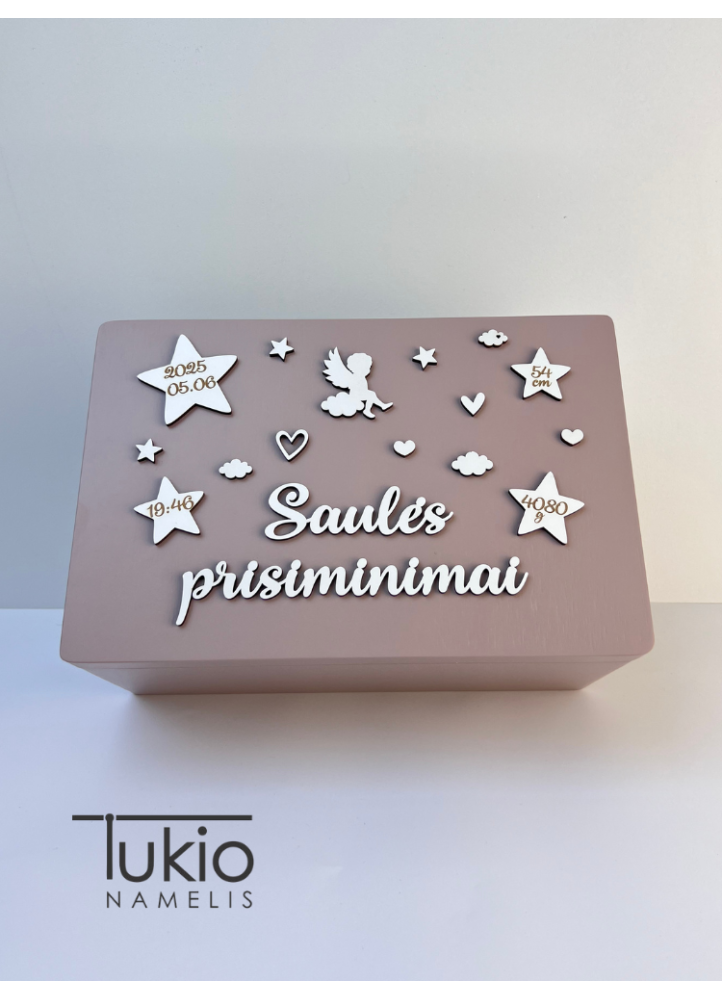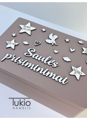 Graži personalizuota dovana krikštynomsir brangus prisiminimų lobynas, skirtas saugoti pirmuosius daiktelius, nuotraukas ir šventės simbolius.