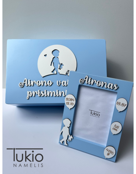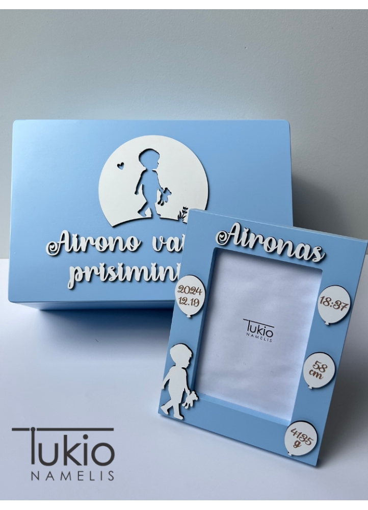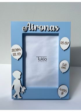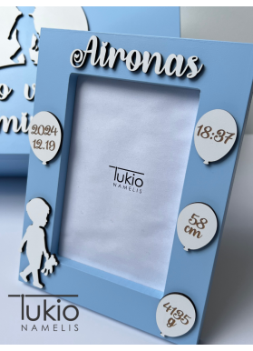 Dekoruotas nuotraukų rėmelis su vaiko gimimo informacija. Gimimo data, laikas, svoris ir ūgis išgraviruoti ant mažų detalių. Nuotraukos matmenys 15x10 cm.
