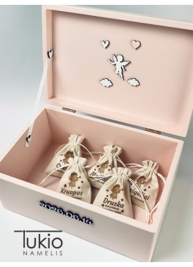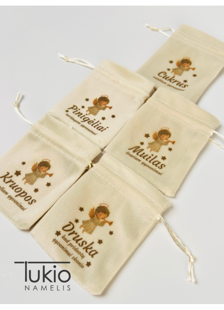 Švelnūs ir elegantiški veliūriniai maišeliai skirti ypatingai krikštynų tradicijai – simbolinėms dovanėlėms, pagal tradicijas, šias dovanas krikštijamam vaikučiui įteikia krikštamotė, linkėdama laimės, sveikatos, meilės ir sėkmės vaiko ateityje.