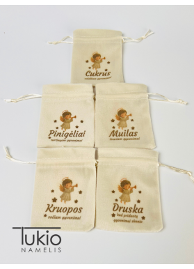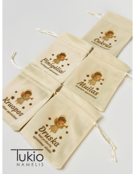 Rinkinyje esantys penki maišeliai puikiai tinka sudėti simbolines dovanėles.