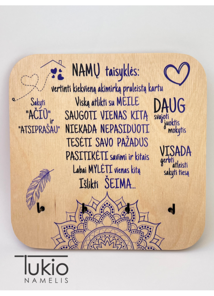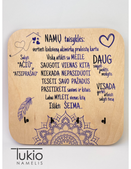 Medinė raktinė „Namų taisyklės“ – tai ne tik patogi vieta raktams laikyti, bet ir šilta namų puošmena, primenanti svarbiausias šeimos vertybes. Raktinė turi patogius kabliukus, todėl kiekvienas šeimos narys ras vietą savo raktams.