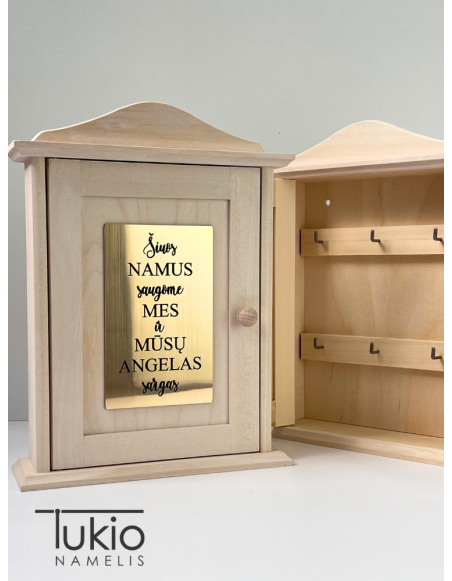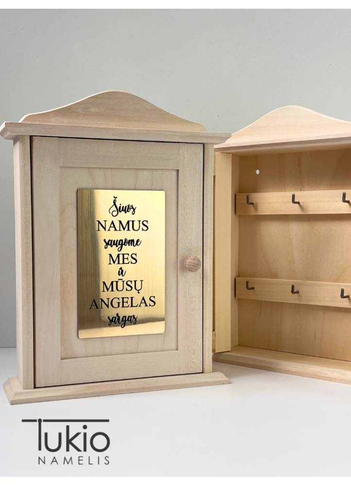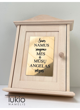 Stilinga medinė raktinė su užrašu „Šiuos namus saugome mes ir mūsų angelas sargas“ – puiki detalė Jūsų namų interjerui.