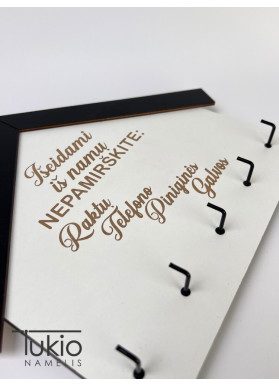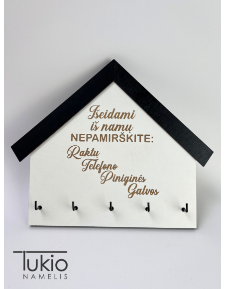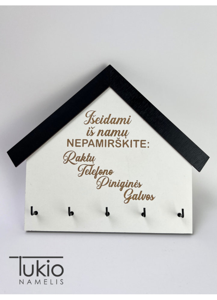 Didelė medinė raktinė su linksmu užrašu „Išeidami iš namų nepamirškite: Raktų, Telefono, Piniginės, Galvos“ – praktiška ir žaisminga namų detalė.