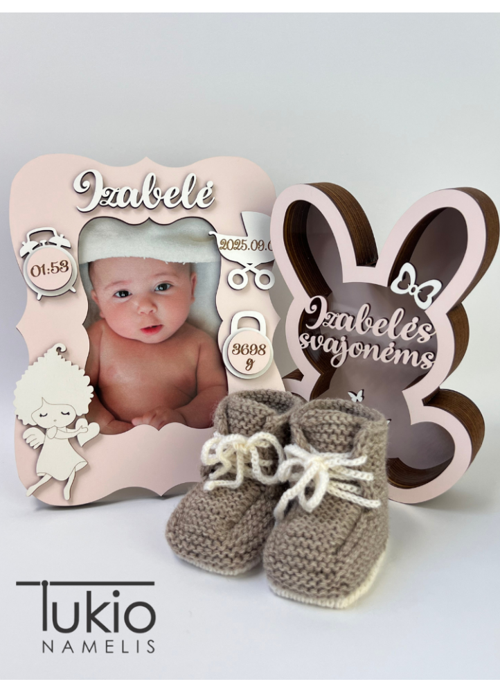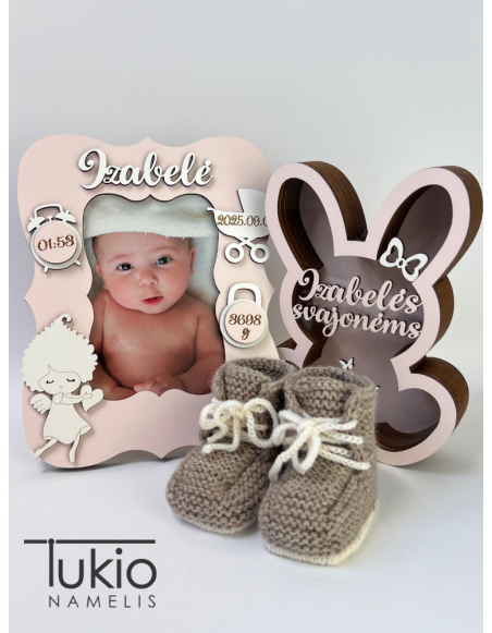 Stilingas medinis nuotraukų rėmelis su vaikučio vardu, gimimo data, laiku, ūgiu ir svoriu.