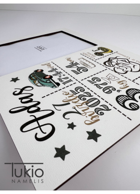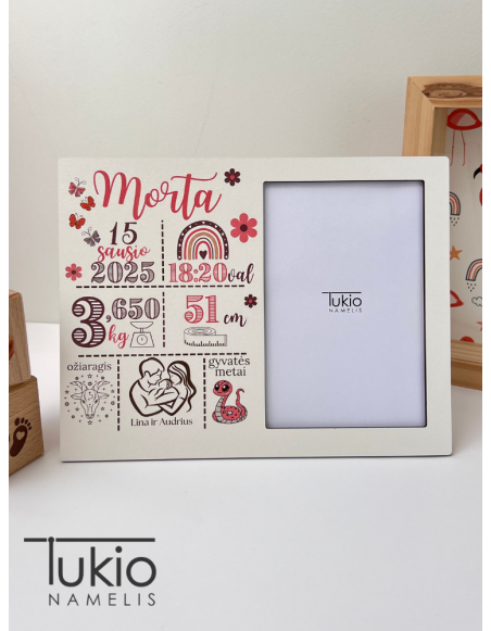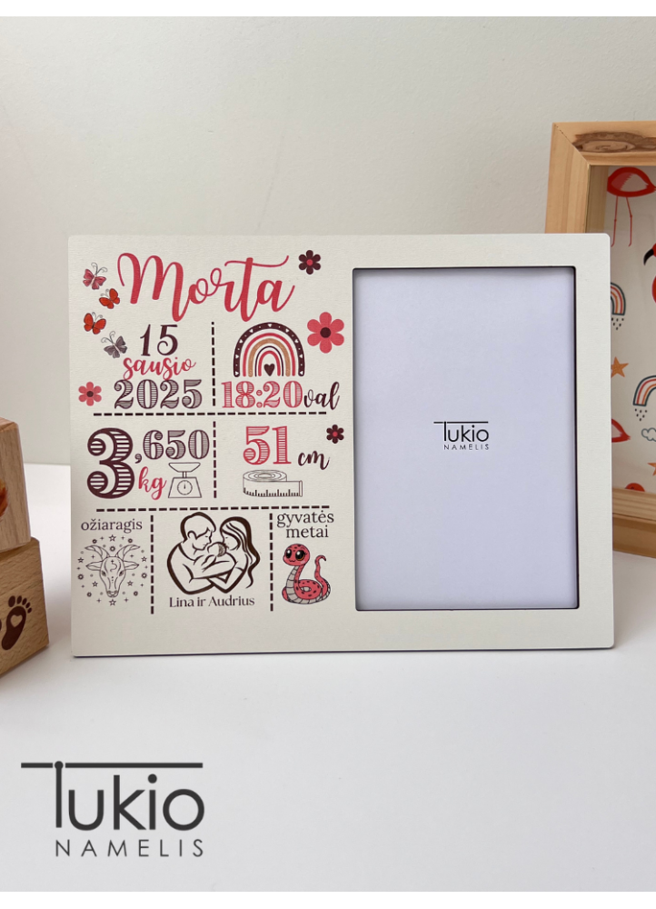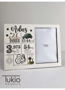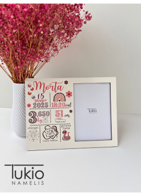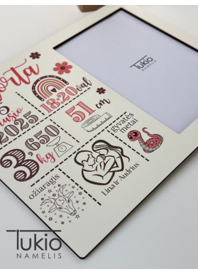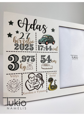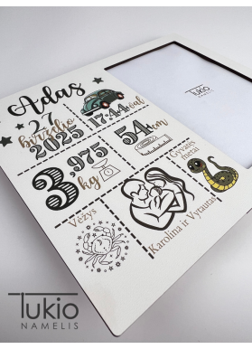 Rėmelis su vaiko gimimo metrikais – švelni ir meile dvelkianti dovana, kuri įamžina svarbiausią gyvenimo dieną. Rėmelis su vaikučio gimimo informacija: vardas, data, valanda, ūgiu, svoriu, horoskopo ženklas, tėvelių vardais – visus brangiausius pirmuosius duomenis, kuriuos tėvai norės išsaugoti visam gyvenimui.