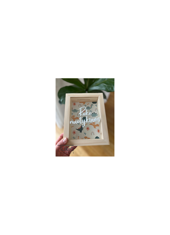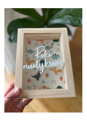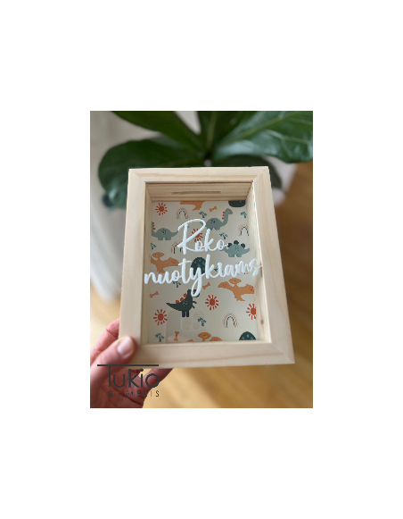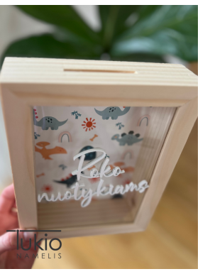 Žaisminga medinė taupyklė su spalvingais dinozaurai ir norimu užrašu – puiki dovana vaikui! Lavina taupymo įgūdžius ir papuošia kambario interjerą.