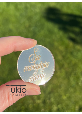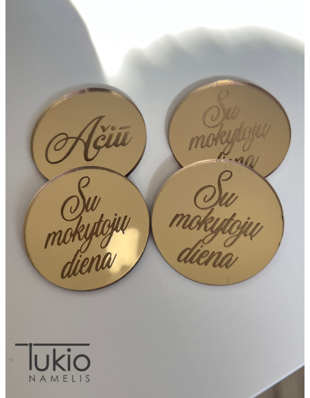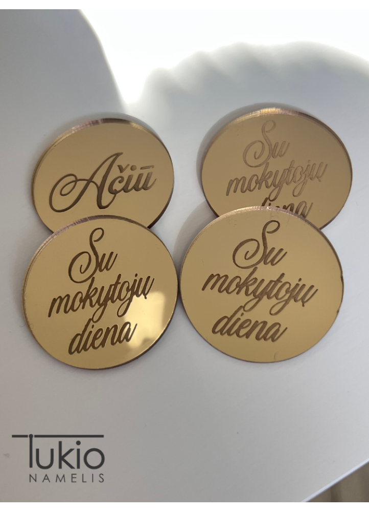 Maži apskritimai su išgraviruotu užrašu, 4 cm skersmens, pagaminti iš auksinio veidrodinio plastiko.
