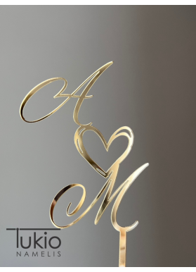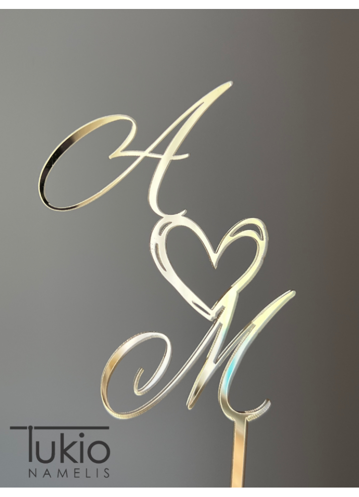 Veidrodinis smeigtukas su jaunųjų inicialais yra puošni ir prabangi vestuvinio torto dekoracija.